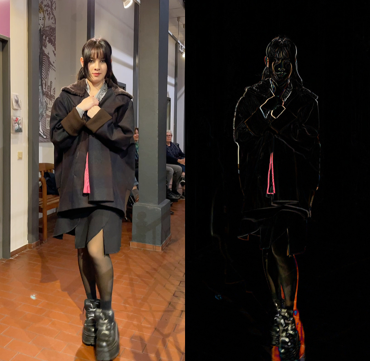 Dass sich das Model in Ewa Kuichs Modenschau auf mich zu bewegt (links), erkennt man anhand der Differenz (rechts) zum folgenden Frame.