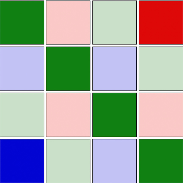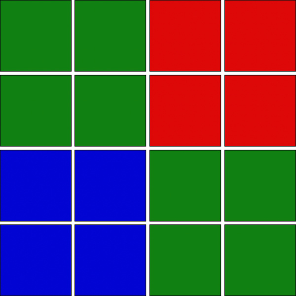 Wie konnte es passieren, dass die kleinen Sensoren ihren größeren Geschwistern hier den Rang abgelaufen haben? Ihre Pixel messen nur noch 0,6 oder 0,7 µm und können daher nicht allzu viel Licht sammeln, was bei weniger als exzellenten Lichtverhältnissen Probleme bereitet. Die Hersteller haben aber einen Ausweg gefunden, und diese Lösung beruht auf einem Farbfiltermuster, das nur auf den ersten Blick wie das vertraute, von Bryce E. Bayer erfundene Bayer-Muster aussieht.