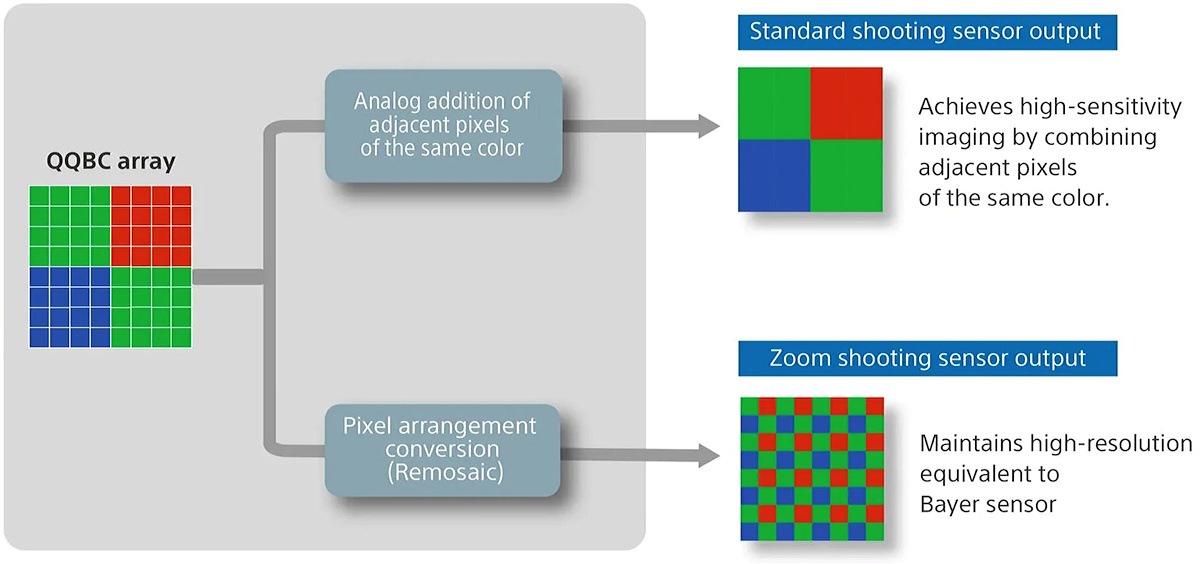 Bei (Quad-)Quad-Bayer-Sensoren gibt es ein Problem: Da vier oder 16 benachbarte Sensorpixel für dieselbe Farbe empfindlich sind, findet man andersfarbige Pixel für die nötige Interpolation der fehlenden Farbinformationen erst in größerer Entfernung. Das würde die erreichbare Auflösung reduzieren, aber zunächst stellt sich noch ein anderes Problem: Geeignete Demosaicing-Verfahren, seien sie konventionell algorithmisch oder auf KI-Modellen basierend, wären erst noch zu entwickeln. Die Sensorhersteller beschritten daher einen Umweg: Mit einem Remosaicing erzeugt der Sensor Pixel im vertrauten Bayer-Muster, mit denen ein Demosaicing auf die übliche Art möglich ist. Sonys Abbildung oben illustriert das Prinzip.