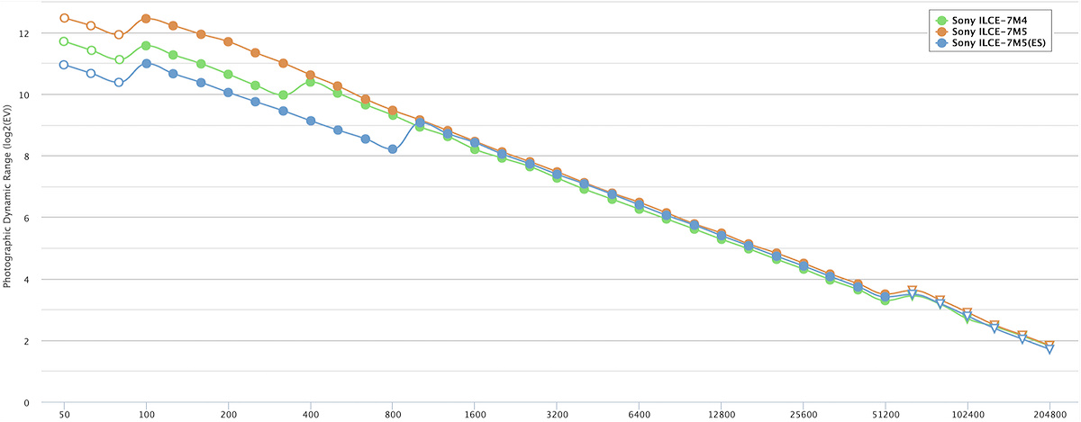 Schaut man sich die Kurven genauer an, so erkennt man, dass die Messpunkte der Alpha 7 V durch Dreiecke markiert sind – statt mit Kreisen wie bei der Alpha 7 IV. Das weist darauf hin, dass Photons to Photos eine bereits in die Rohdaten eingerechnete Rauschunterdrückung entdeckt hat, die also nicht rückgängig gemacht werden kann. Ein geringeres Rauschen führt naturgemäß zu einem größeren Dynamikumfang, wobei aber nagende Zweifel bleiben, die Rauschunterdrückung könnte die Bildqualität und insbesondere die Detailauflösung beeinträchtigen. Ob dieser Argwohn berechtigt ist, kann man derzeit noch nicht sagen, aber die gemessene Verbesserung des Dynamikumfangs hat ohnehin nur wenig mit der Rauschunterdrückung zu tun – diese bringt lediglich einen Zugewinn von rund 1/6 EV. Wie aber ist der Sprung um 1 EV zu erklären, der zwischen ISO 100 und 320 gemessen wurde? Also in dem ISO-Bereich, in dem der Sensor der Alpha 7 IV im Low-Conversion-Gain-Modus betrieben wird, während die Alpha 7 V keine Umschaltung mehr vorzunehmen scheint?