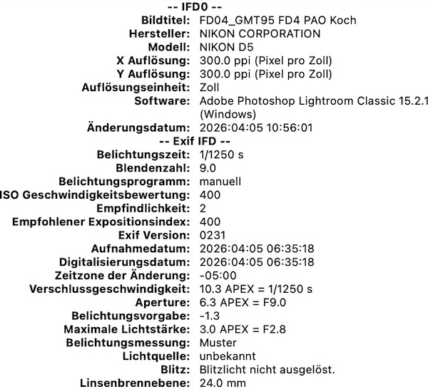 Weitere Informationen können wir den Exif-Metadaten der Bilddatei entnehmen, neben dem Aufnahmezeitpunkt unter anderem auch die verwendete Kamera (hier eine Nikon D5) und die Brennweite (24 mm). Die lichtempfindliche Fläche des Kleinbildsensors einer D5 misst laut Datenblatt 35,9 mm × 23,9 mm.