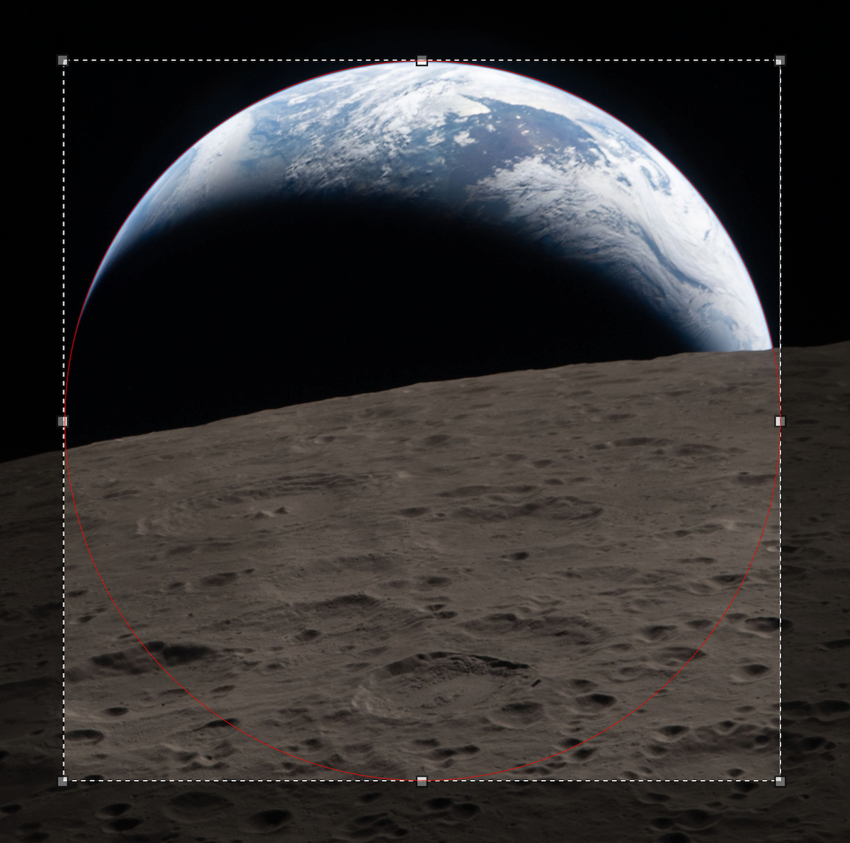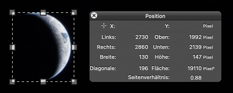Da die Erde ja nicht vollständig zu sehen ist, habe ich einen Kreis eingeblendet, der der Kontur des sichtbaren Teils folgt, und dieser Kreis ist 1912 Pixel hoch. Das ist nicht weit von den erwarteten 1945 Pixeln entfernt, so dass die Abbildung der Erde auch in dieser Aufnahme stimmig erscheint. Die kleine Abweichung könnte darauf zurückzuführen sein, dass die längste Brennweite des 80–400-mm-Zooms den im Datenblatt genannten Wert vielleicht nicht ganz erreicht. In die Exif-Daten wird auch dann die nominelle Brennweite eingetragen.
