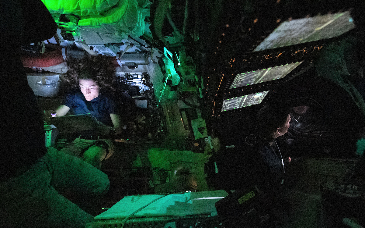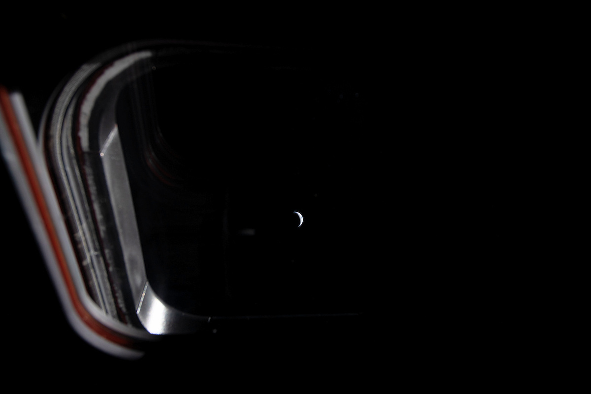 Zum Zeitpunkt dieser Aufnahme, wiederum mit einer Nikon D5, aber diesmal mit einem Telezoom und dessen Maximalbrennweite von 400 mm, dürfte die Raumkapsel rund 406.000 km von der Erde entfernt gewesen sein. Die Brennweite verhält sich zur Entfernung wie die scheinbare Größe der Erde zu ihrer tatsächlichen Größe – also wiederum 12.713,5 km. Das Bild der Erde müsste demnach 400 mm × 12.713,5 km / 406.000 km = 12,526 mm groß sein, wiederum auf drei Nachkommastelle gerundet. Bei einer Sensorhöhe von 23,9 mm und einer Bildhöhe von 3712 Pixeln entspricht das 3712 Pixeln × 12,526 mm / 23,9 mm = 1945 Pixeln. Schauen wir im Bild nach: