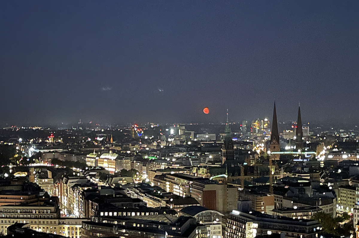 Der auf- oder untergehende Mond erscheint rötlich, ganz ähnlich der tief stehenden Sonne. In der Stadt ist das aber nur selten zu beobachten, da der Horizont fast überall durch Gebäude verdeckt wird. Das Licht der Sonne färbt auch die Wolken unübersehbar orange bis rot, während sie selbst hinter Hochhäusern verborgen bleibt, aber beim schwächeren Mondlicht ist dieser Effekt nicht zu beobachten.