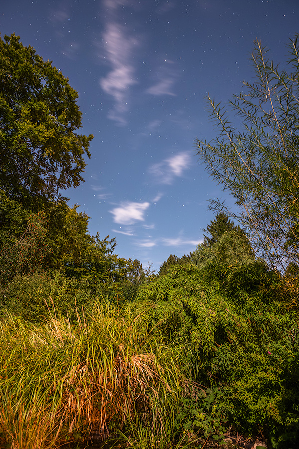 Man sieht es zwar gewöhnlich nicht, aber auch in der Nacht gibt es einen blauen Himmel – jedenfalls so lange der Mond scheint. Auch das vom Mond reflektierte Sonnenlicht wird in der Atmosphäre gestreut, und wiederum vor allem dessen blaue Anteile. Da aber schon das Mondlicht vielfach schwächer als das direkte Sonnenlicht ist, nehmen wir dessen noch einmal schwächeres gestreutes Licht nicht wahr. Es zeigt sich allerdings in Langzeitbelichtungen, und so entstandene Fotos einer vom Mond beleuchteten nächtlichen Landschaft unter einem blauen Himmel sind auf den ersten Blick nicht von Tageslichtaufnahmen zu unterscheiden.