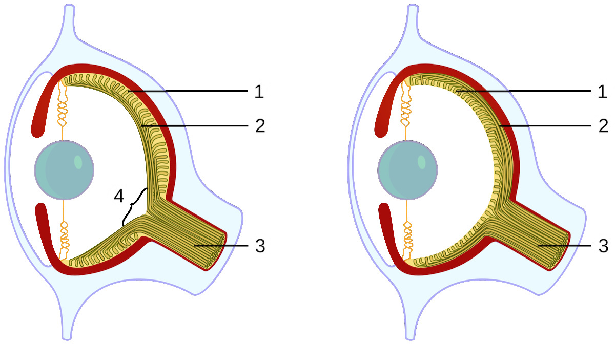 Bei Wirbeltieraugen wie dem Auge des Menschen (links) liegen die Sehbahnen (2) in einer Netzhautschicht über den Fotorezeptoren (1), während es beim Oktopusauge (rechts) umgekehrt ist. Deshalb hat nur das Wirbeltierauge dort, wo der Sehnerv die Verbindung zum Gehirn herstellt (3) einen Blinden Fleck (4). (Illustration: Caerbannog, CC BY-SA 3.0)