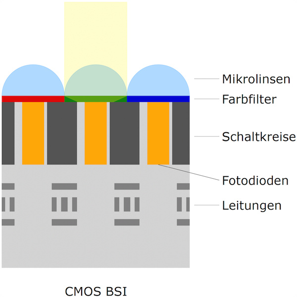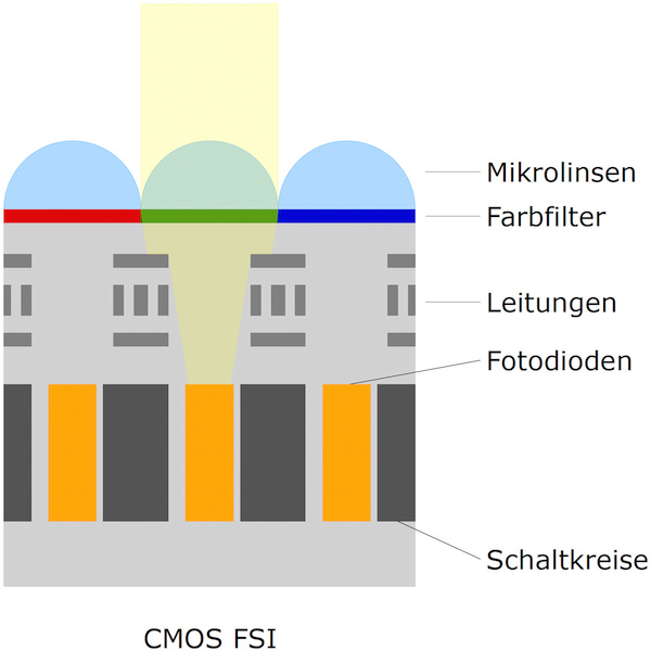 Um die Pixel eines Sensorchips steuern und auslesen zu können, sind darüber hinaus elektrische Leitungen nötig, die zwischen den Pixeln auf den Chip aufgebracht werden. Bei einem FSI-Sensor mit frontseitiger Belichtung liegen die lichtempfindlichen Fotodioden der Pixel unter der Verdrahtung und werden von den Leitungen teilweise verschattet. Insbesondere wenn das Pixelraster eng und die Pixel entsprechend klein sind, ist es ein wenig so, als stünde man in einer Straßenschlucht zwischen Hochhäusern und könnte beim Blick nach oben nur einen kleinen Teil des Himmels sehen. Für die einzelnen Fotodioden ist die Situation ähnlich: In flachem Winkel einfallendes Licht erreicht sie gar nicht mehr, und besonders lichtstarke Objektive bringen keinen Vorteil, weil die Fotodioden deren große Austrittspupille nicht vollständig sehen können.