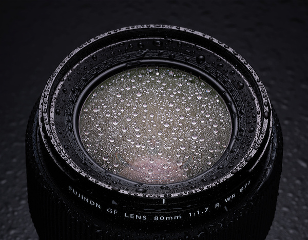 Die Fluor-Vergütung der Frontlinse des Fujinon GF 80 mm F1.7 R WR macht sie wasser- und schmutzabweisend. (Foto: Fujifilm)